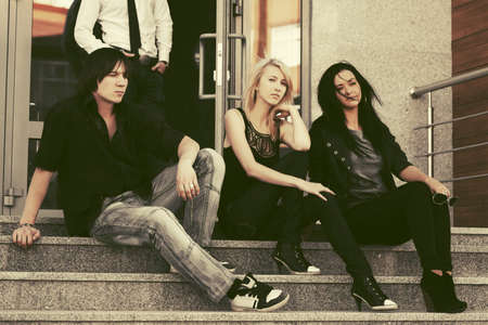 Young fashion men and women sitting on the steps. Stylish trendy male and female models outdoor