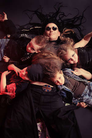 Heavy metal musician with children lying on a floor. Shot in a studio.