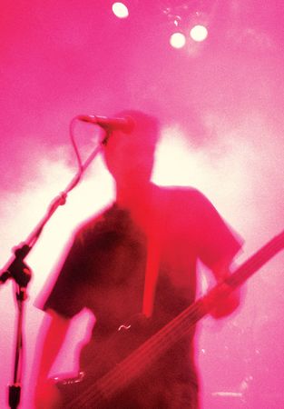 Grainy blurry atmospheric abstract image of a bass player in front of a microphone. Shot with 3200 iso slide film and slow shutter speed.