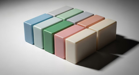 Rectangular blocks in various pastel colors are neatly arranged in rows on a white surface.