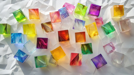 Spectrum of light from colored dichroic glass cubes, sparkling on white textured paper, showcasing artistic dispersion.