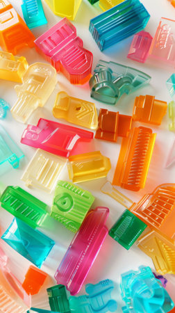 Assorted multicolored plastic construction kit with scattered parts for creative building projects