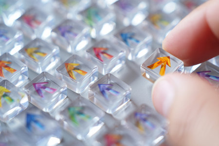 A captivating display of translucent, multicolored cubic shapes arranged in a dynamic composition, creating a visually engaging and abstract study of light.