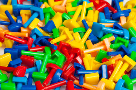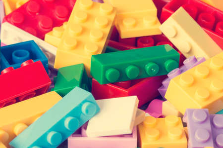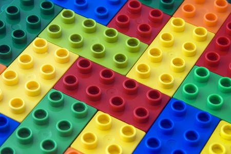children's play background: the plane of plastic multi-colored bricks, blur, selective focus