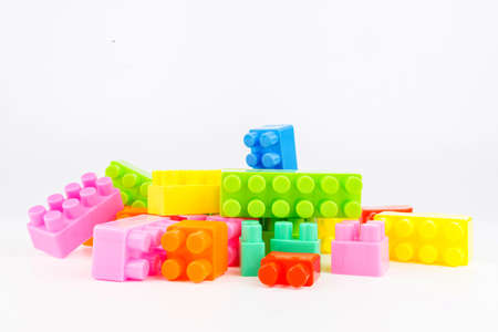 Lot of colorful rainbow toy bricks background. Educational toy for children Isolated on white background. Top view with copy space