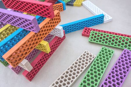 Educational and logical games for children. Bright interesting modern childrens colorful beautiful constructor background. Activities for children outside the home. Creative and educational concept. Eco-friendly building blocks