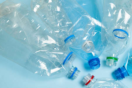 Used empty crumpled plastic bottles on blue background. Recycling recycled plastic. Pollution, environmental protection.