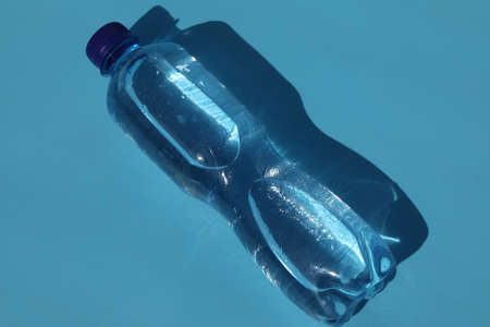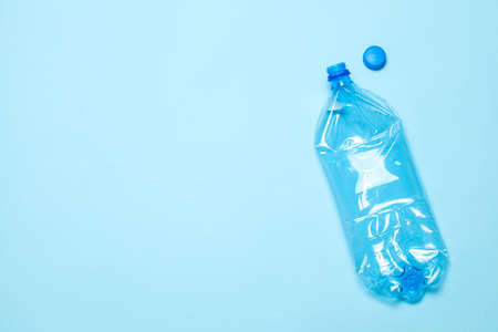 Empty rumpled used plastic bottle on blue background. Top view, copy space. Pollution, environmental protection concept. Reuse garbage, recycle, plastic free. Earth, world water day