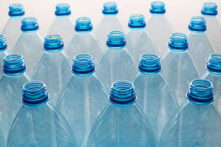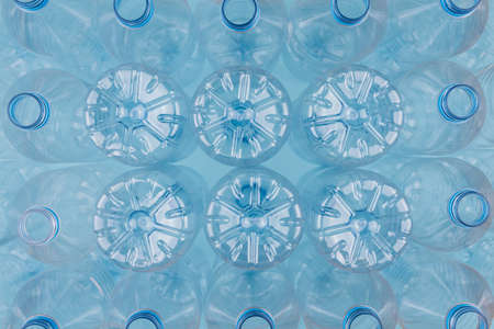 Horizontal color image with an overhead view of an empty clear plastic bottles upside down stacked on a blue background. Recycling and environment concept.