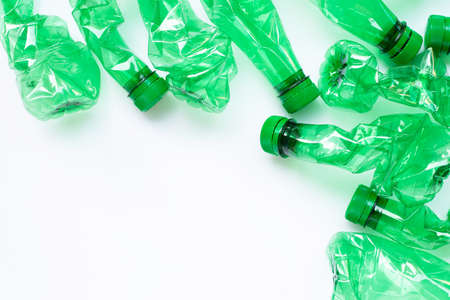 Plastic bottles on white background. Copy space