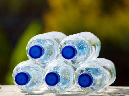 Group of plastic bottles with water.