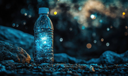 Glowing water bottle on rocks, night, bokeh background, environmental concept