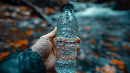 Hand holding a water bottle by a stream