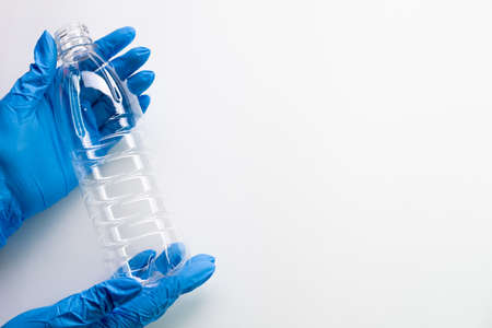Plastic recycling. Waste management. Protect ecology. Hands in surgical gloves holding transparent empty water bottle isolated on white copy space background.