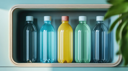 one glass bottle among several plastic bottles on a blue background, combating pollution of nature, plastic recycling, conscious consumption concept
