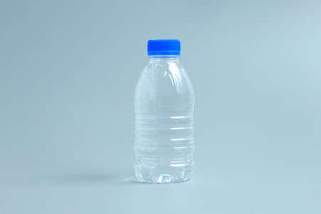 Plastic bottle of water on a white table and blue background.
