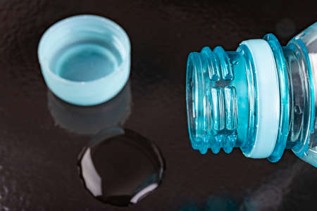 Plastic bottle neck and water. Water storage container. Dark background.