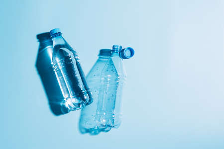 Plastic bottles with water and empty used blue background. Recycling recyclable plastic. Environmental protection