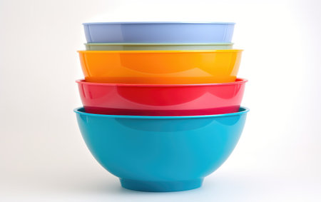 Assortment of colorful ceramic bowls on clean white background, vibrant and practical