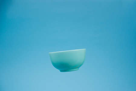A blue ceramic mattle deep bowl for breakfast flying on blue background. Ideal photo for levitation of food and fruits or nuts.