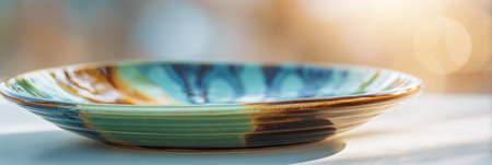 A beautifully crafted ceramic plate with vibrant colors rests on a flat surface, illuminated by soft natural light and surrounded by a pleasant blur.