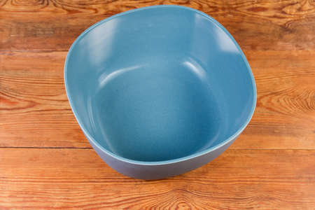 Empty plastic blue-gray salad bowl on the rustic table, top view