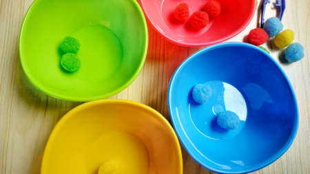 Colorful montessori materials for kids with tweezer. good for sensory kids. education for kids. bowl of montessori materials