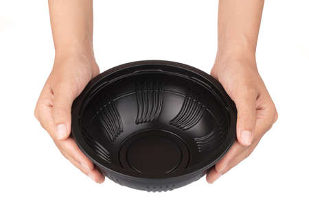 Hands holding Black of bowl isolated on white background.