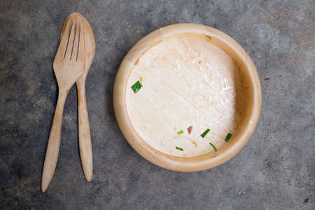 Empty wooden bowl after eating on table
