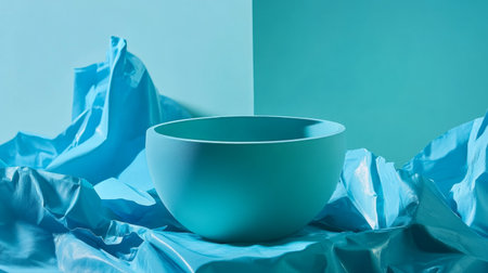 A minimalist turquoise bowl placed on crumpled fabric with complementary shades of blue in a clean, modern composition.