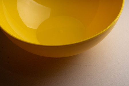 A yellow salad bowl with water drops on the wall is on the table.