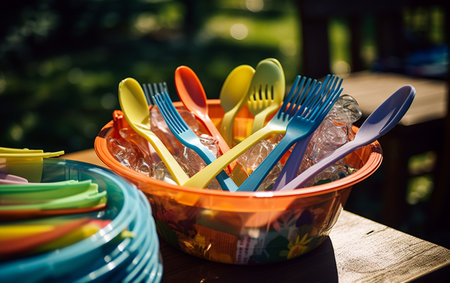 colorful plastic tableware on a gray background