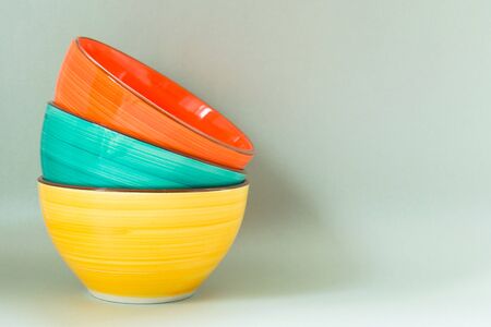 Empty ceramic colored bowls on a gray background.copy space