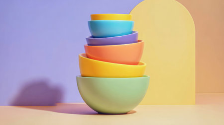 Brightly colored stacked bowls create a cheerful arrangement against a geometric backdrop, perfect for food styling, kitchen decor, and creative photography projects.