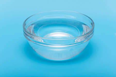 Pure, clear drink water in glass bowl or plate on blue background