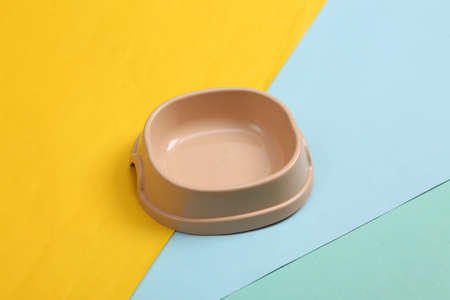 Empty bowl for cat food on colored background.