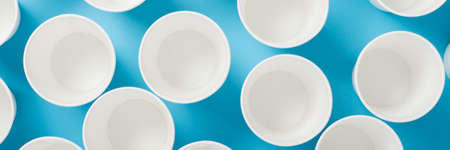 Empty paper cup for drinks on a blue background. Banner. Flat lay, top view.