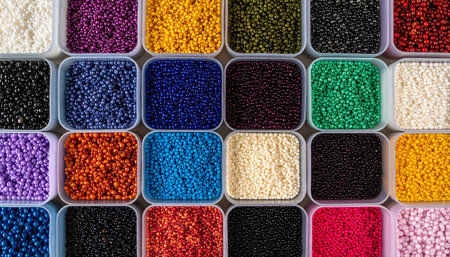 A detailed overhead view of many plastic containers filled with a wide array of small, colorful beads and granular materials.