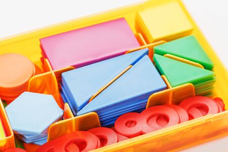 A box with Colorful plastic figures and numbers on a white background. Educational games for children. Math and calculation skills. The view from the top