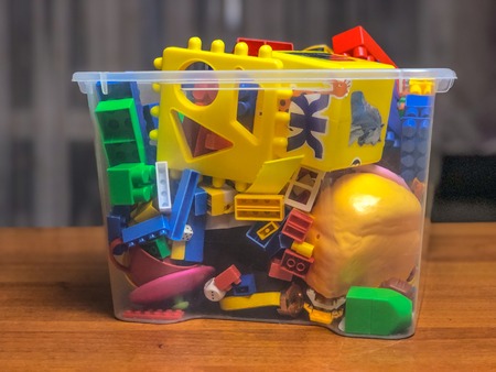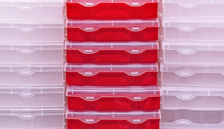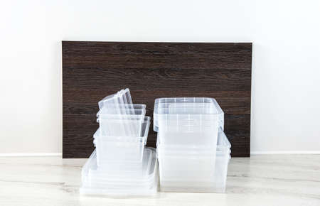Lot of empty clear plastic storage boxes stacked. Ready for home organizing sorting concept.