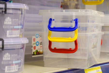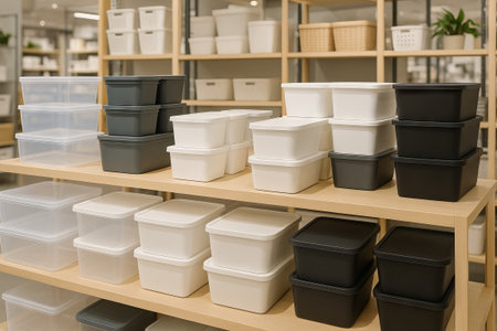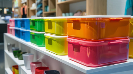 Colorful Plastic Storage Containers Arranged Neatly on a Retail Display Shelf in a Modern Store During Daylight Hours. Generative AI