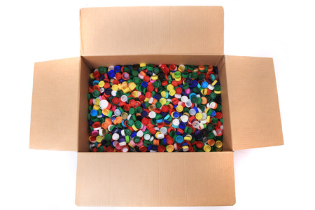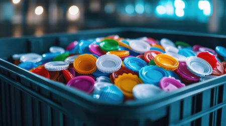 Dark container filled to the brim with recyclable plastic caps, emphasizing reuse potential