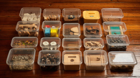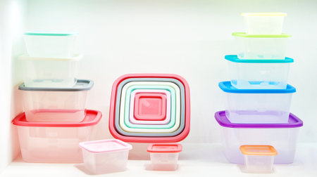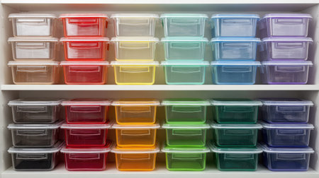 An artistic arrangement of colorful plastic containers in various shapes, enhancing modern kitchens and homes with style and organization for everyday use.