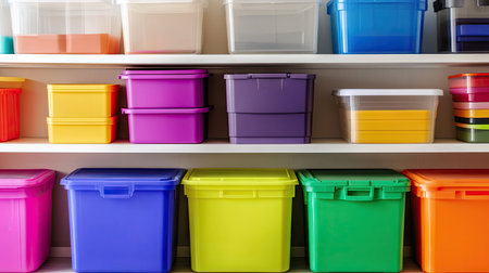 A vibrant collection of plastic storage bins neatly displayed on shelves, showcasing an organized home environment ideal for efficient space management and decluttering.