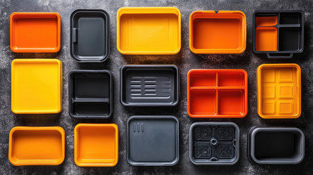 A stylish arrangement of colorful food storage containers in orange, yellow, and black. Perfect for meal prep and kitchen organization on a dark surface.