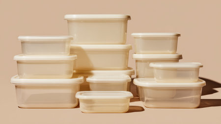 A visually appealing arrangement of transparent plastic food storage containers in various sizes on a beige background, perfect for kitchen organization and meal prep.