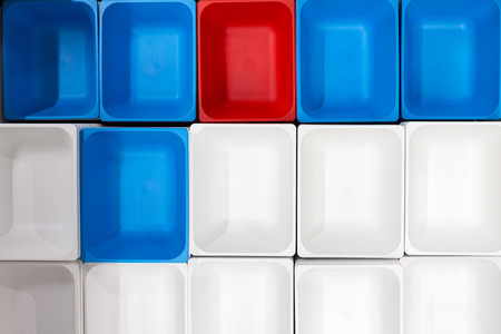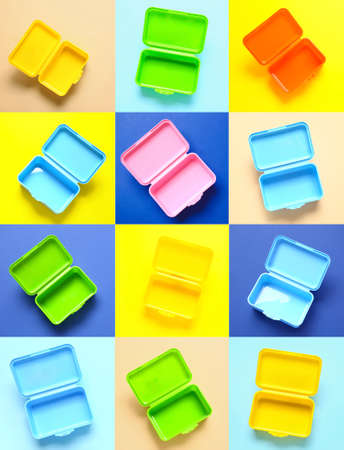 A colorful assortment of plastic trays, including a green one, sit on a wooden surface. The trays are arranged in a way that creates a sense of variety and abundance