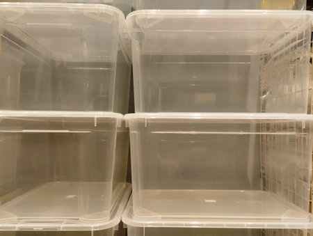 A collection of transparent storage boxes arranged neatly on a clean surface, representing minimalism and organization. Ideal for various storage solutions.
