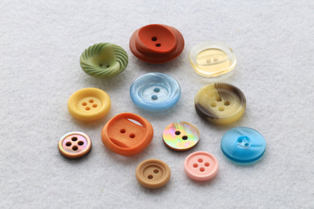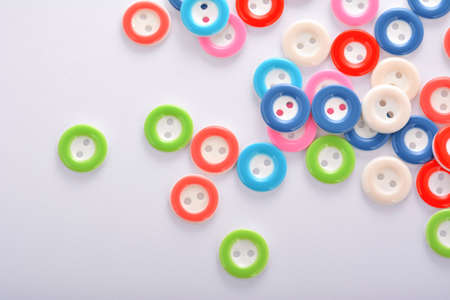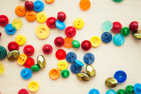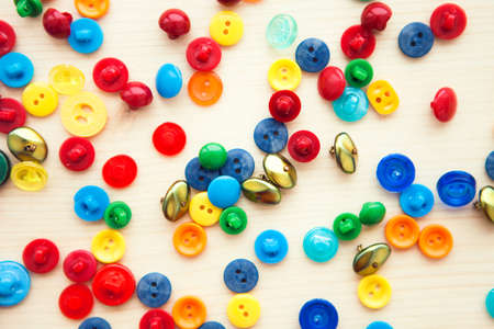 Multi-colored buttons background. Used buttons on a light textured surface. Side view. Selective focus. Eye level shooting.