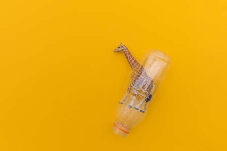 Giraffe is entangled in a plastic bag. Plastic animal concept. Yellow background. Environmental pollution problem.
